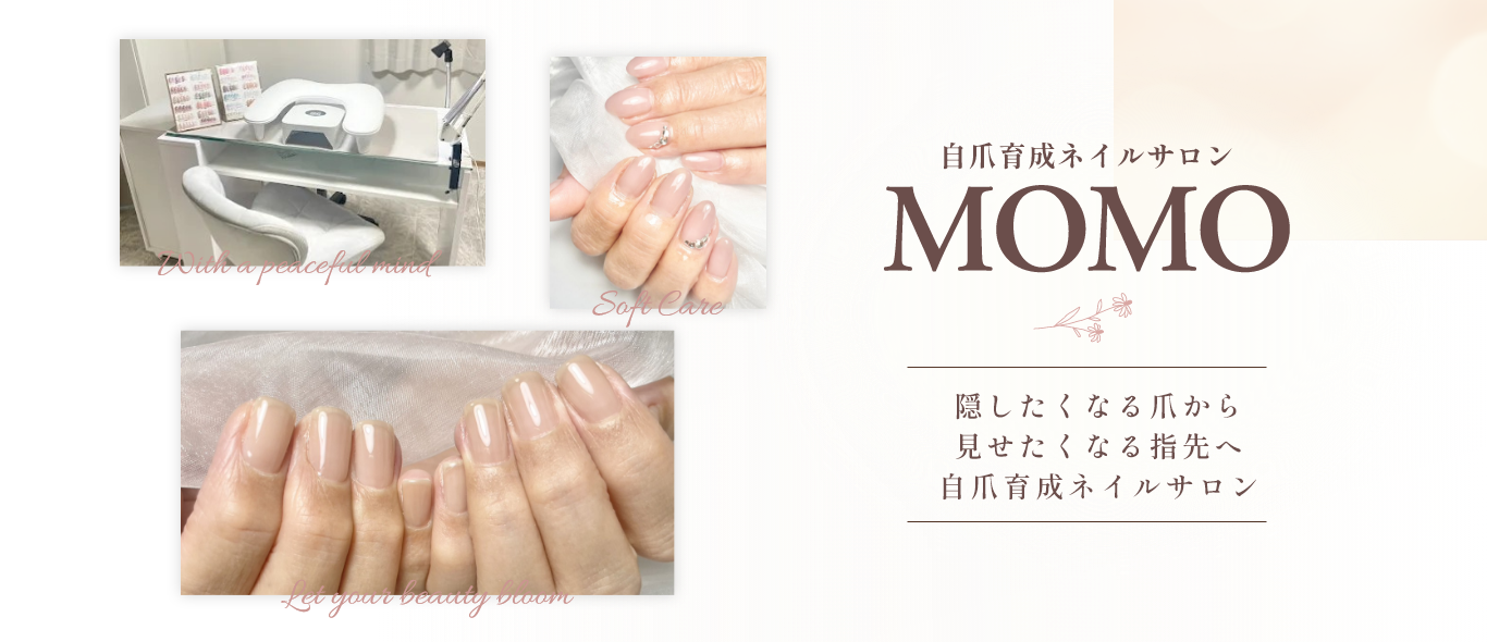 自爪育成ネイルサロン MOMO は、深爪・噛み癖・爪の形にお悩みの方に寄り添う 自爪育成専門サロン です。
